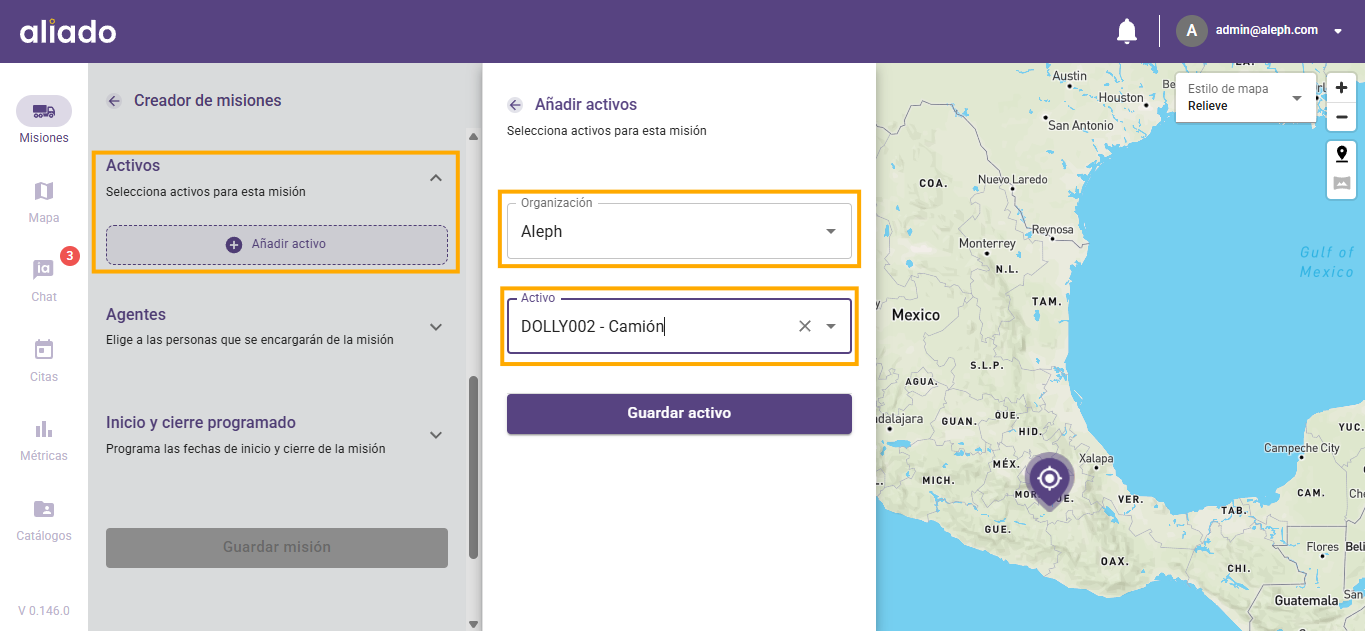 - Añada los Activos requeridos para la misión, seleccionando el botón Añadir activos