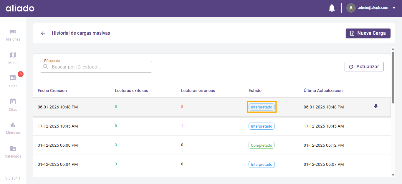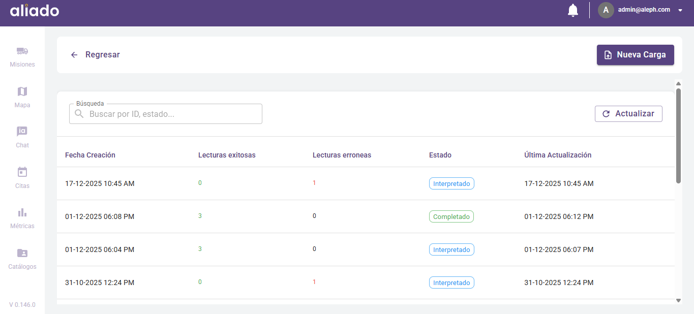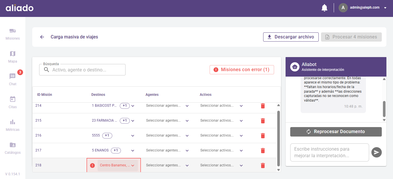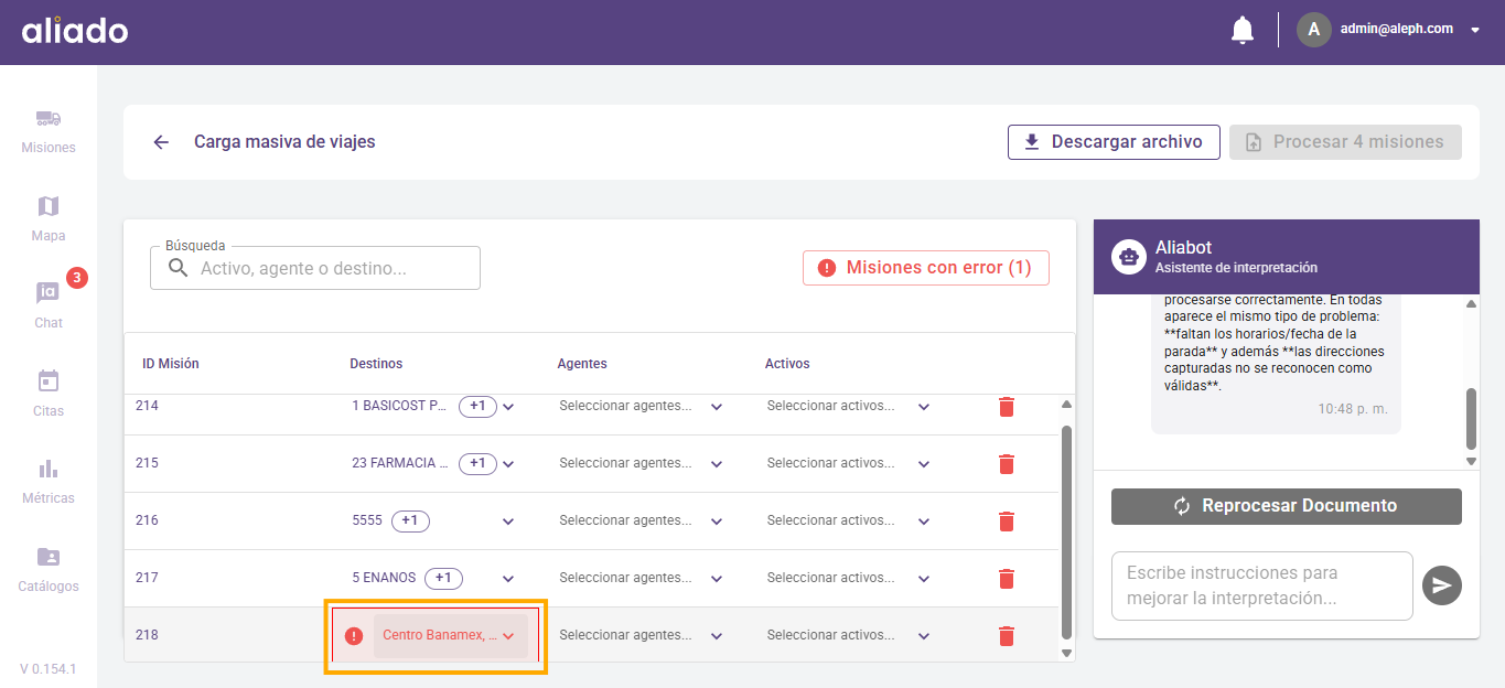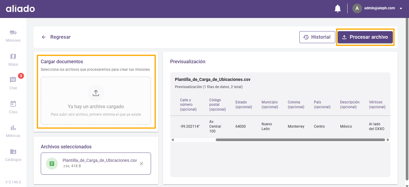 Después de procesar el archivo, le aparecerá una pantalla donde se mostrará si existe algún error y el estado en el que se encuentré el archivo de la misión