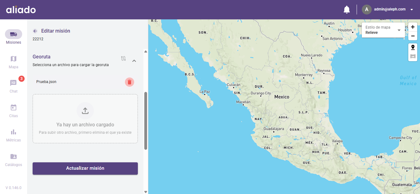 - Añada la Geo Ruta en su sección, tendrá que dar clic en subir archico archivos permitidos (.kml, .geojson)