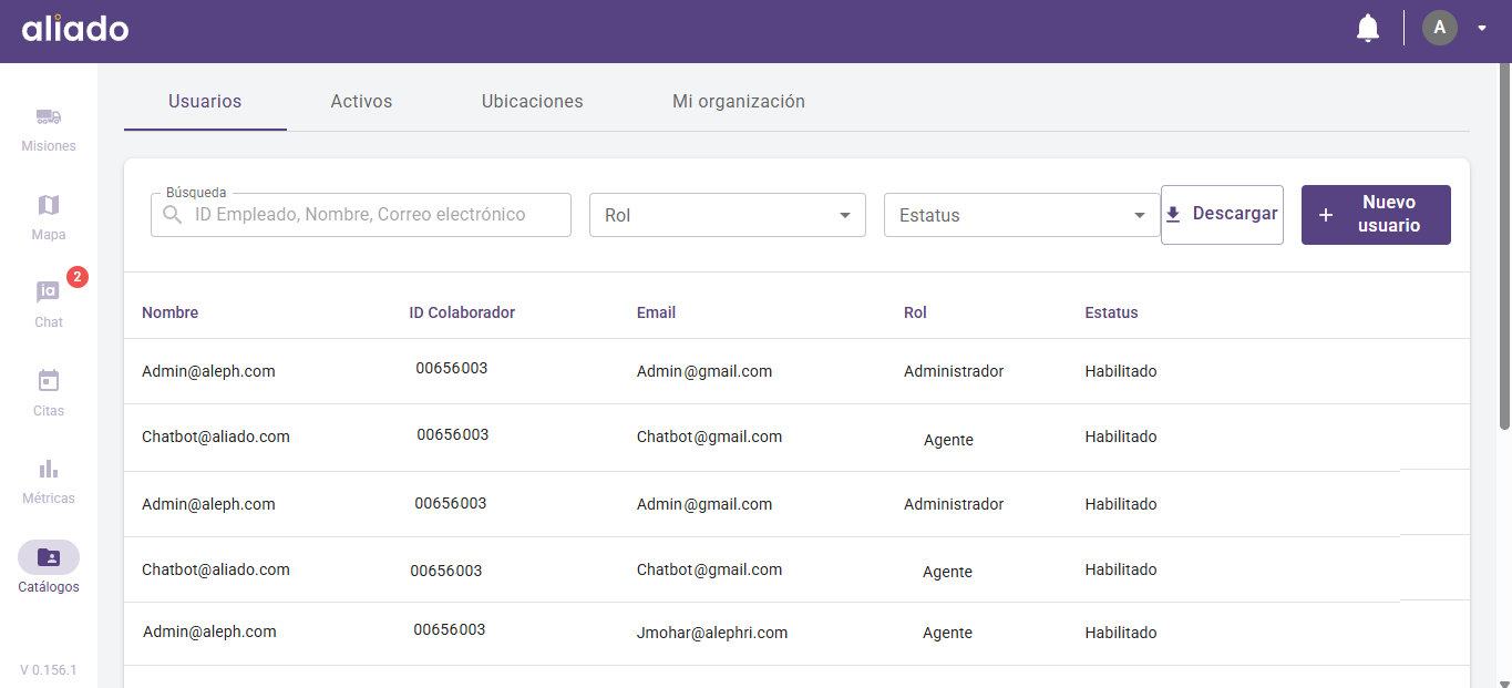 En la siguiente pantalla podrá visualizar el cátalogo existente de Usuarios, Activos y Ubicaciones