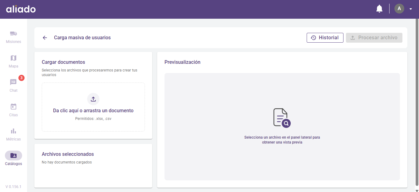 Después tendrá que cargar el documento para su carga masiva, en la sección "Cargar documentos", los archivos permitidos son .xlsx, .csv.