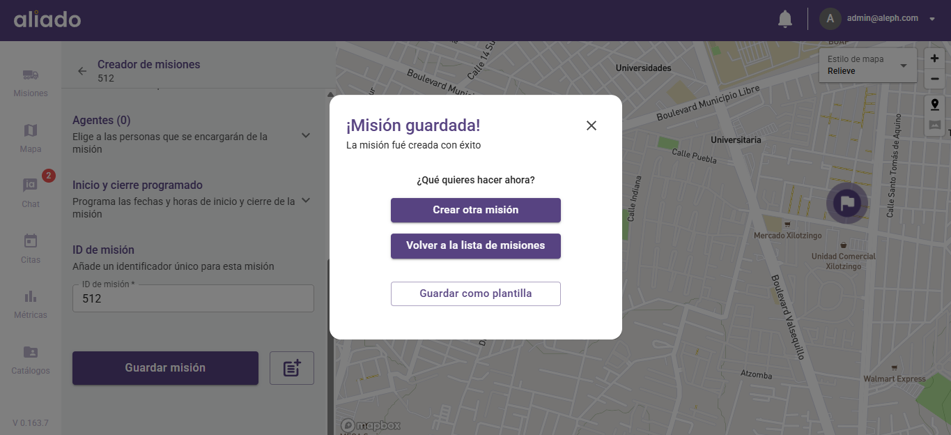 Ya que se guardó la misión, le aparecerá un mensaje de confirmación, y unos botones, puede guardar una plantilla con la misión, por si posteriormente la desea volver a ocupar.