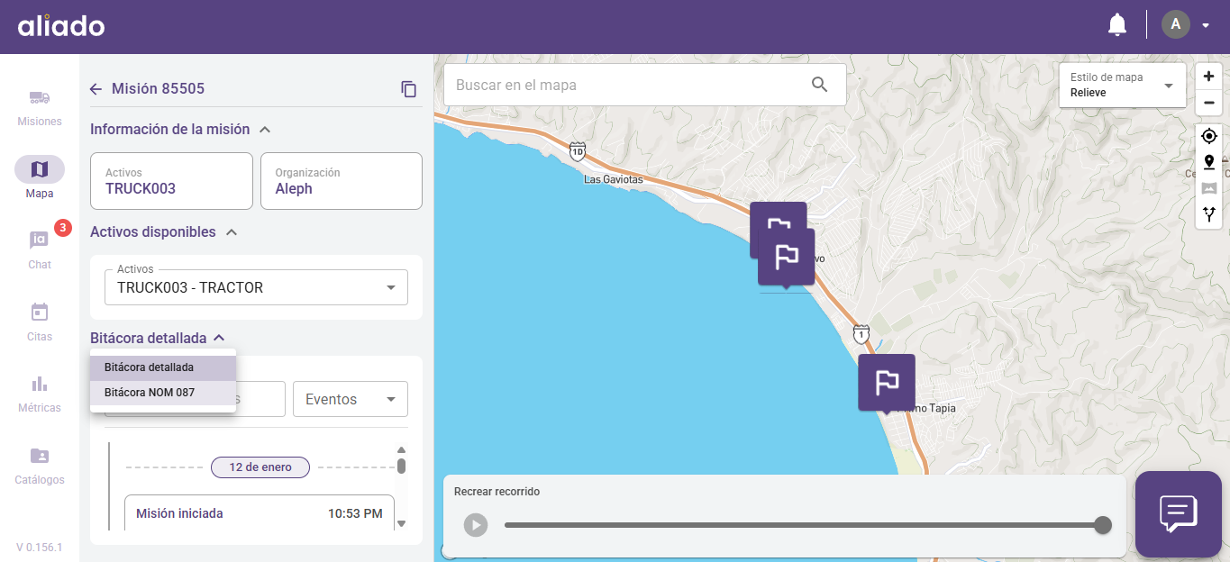 Ya que se encuentra abierto el mapa de detalle, del lado izquiero logrará ver la Bitácora detallada
