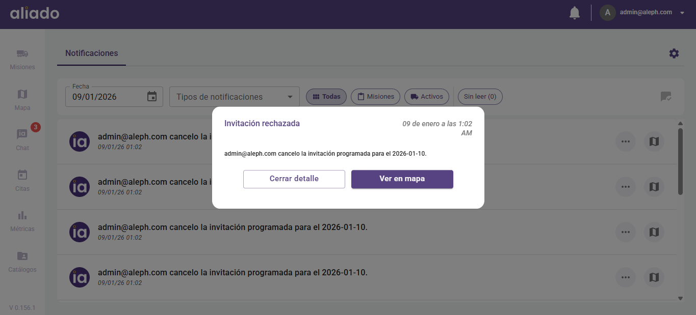 Al abrir la pantalla de notificaciones completa, puede acerca el cursor a la notificación (a los 3 puntitos o al mapa), para obtener más detalle sobre esa notificación