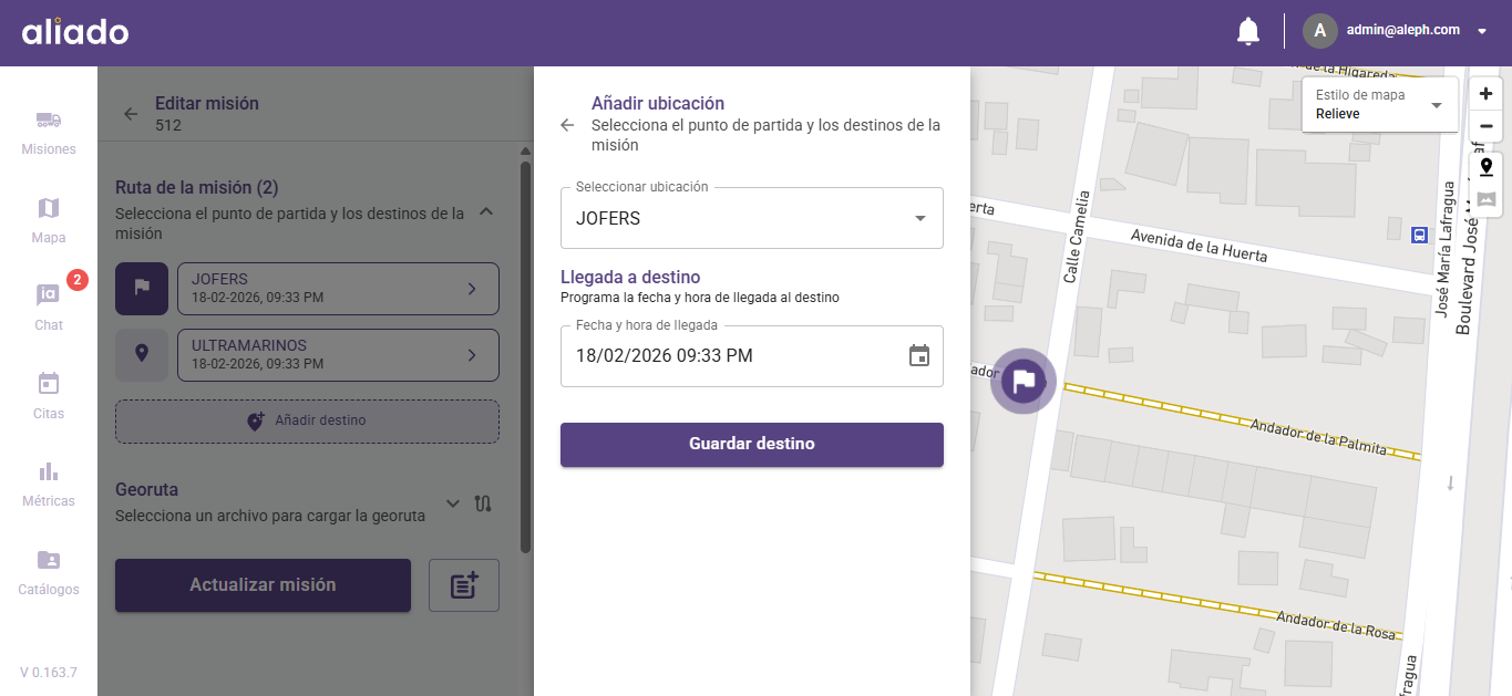 Para cambiar/agregar destinos seleccione el destino de la misión deseada, se abrirá el apartado donde puede modificar el destino y "añadir un destino"