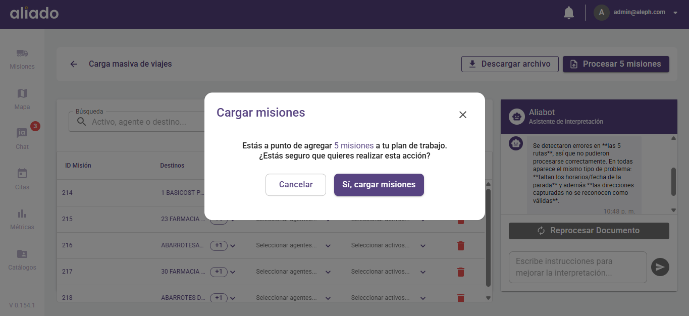 Una vez modificados lo errores, podrá procesar las misiones, le aparecerá un mensaje de confirmación, una vez que este seguro de que es correcta la información podrá darle clic al botoón "Sí, cargar misiones"